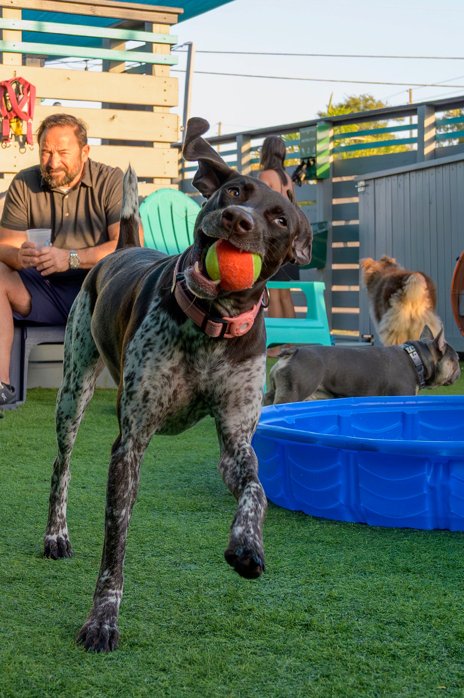 Our off-leash play areas are thoughtfully designed with 6-foot fencing, double-gated entrances, dog playgrounds, puppy pools, and artificial turf to keep things clean and comfy. During peak hours, our trained park supervisors—aka Rufferees—are on duty to help keep playtime safe, friendly, and full of wagging tails.